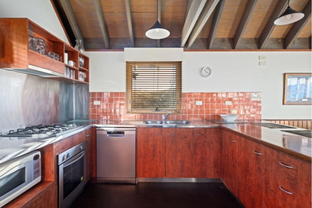 Kitchen with gas cooking, electric oven, dishwasher. Living area with coonara wood heater.